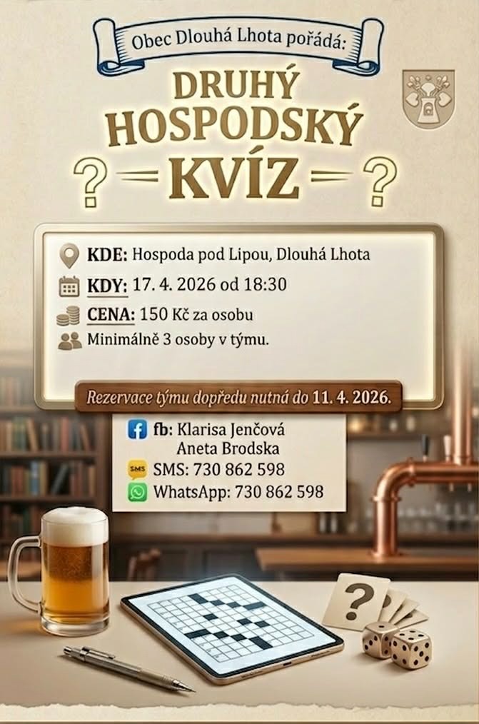 Obec Dlouhá Lhota zve všechny občany a přátele z okolí na druhý hospodský kvíz, který prověří vaše znalosti, postřeh i týmovou spolupráci.