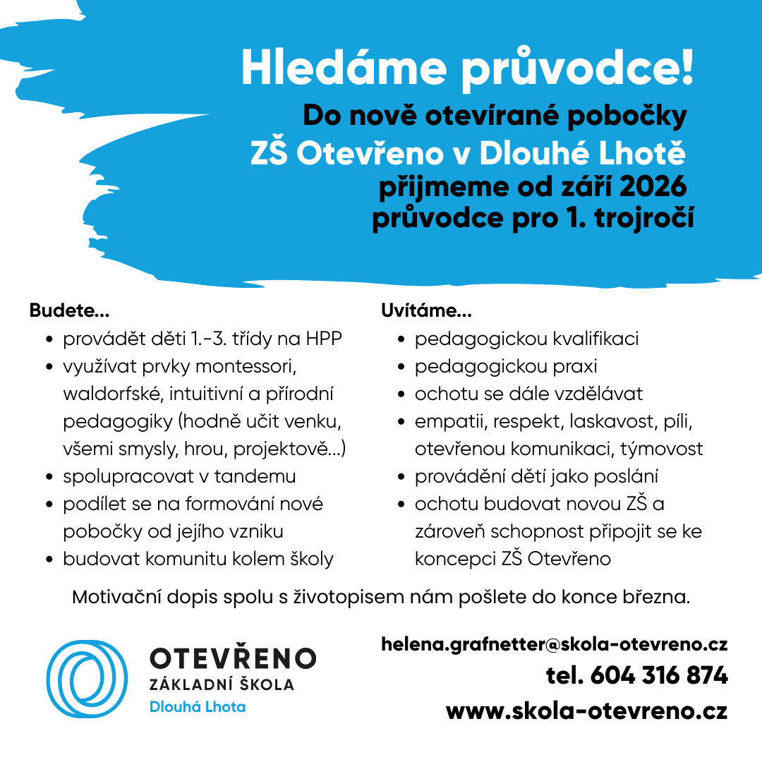 Zájemci o pozici průvodce (učitele) budou pracovat s dětmi 1.–3. tříd, spolupracovat v týmu a aktivně se podílet na tvorbě prostředí školy. Výhodou je pedagogická kvalifikace či praxe, důležitá je však především empatie, otevřenost a nadšení pro vzdělávání.