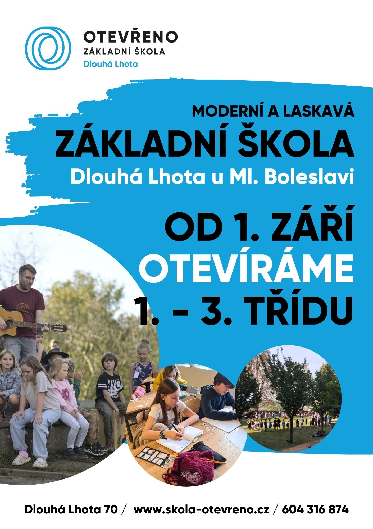 Informujeme, že se od září 2026 skutečně rozjede vzdělávání v nové Základní škola Otevřeno v Dlouhé Lhotě. Škola aktuálně přijímá předškoláky a žáky 1.–3. třídy.