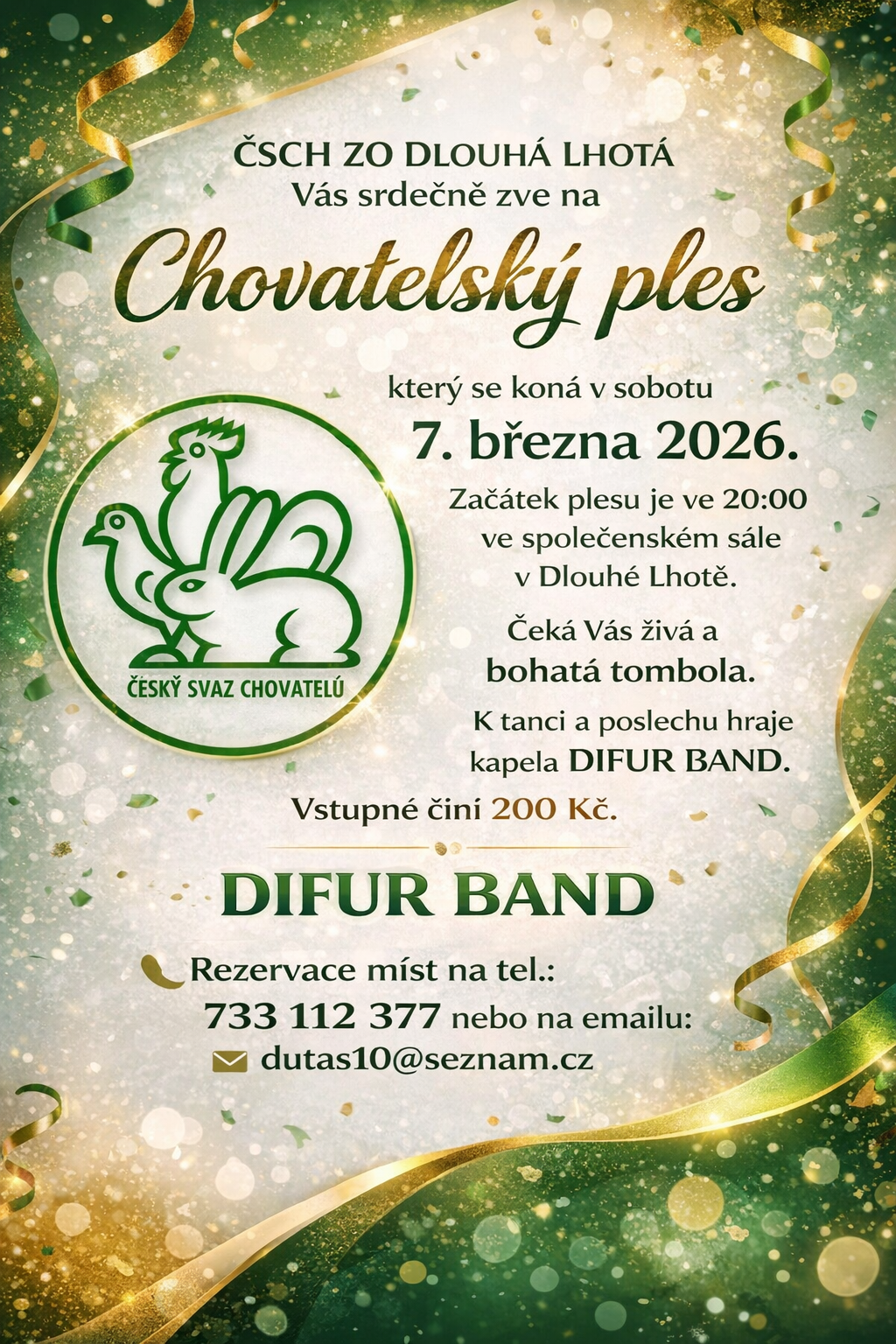 - sobota 7. 3. 2026 – Chovatelský ples – od 20:00 hod. Tradiční živá a bohatá tombola. Pořádá ČSCH ZO Dlouhá Lhota. Hraje Difur Band. Rezervace míst na: tel.: 733 112 377 nebo emailu: dutas10@seznam.cz