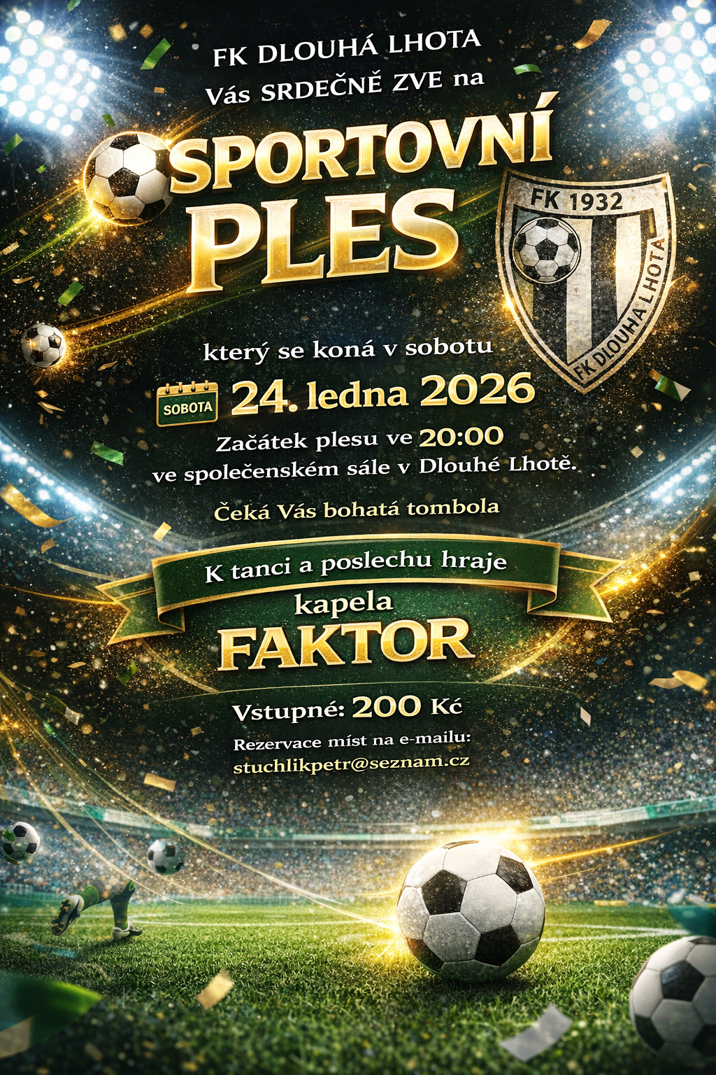 - sobota 24. 1. 2026 – Sportovní ples – od 20:00 hod. Tradiční bohatá tombola. Pořádá FK Dlouhá Lhota. Hraje FAKTOR. Rezervace míst na: stuchlikpetr@seznam.cz
